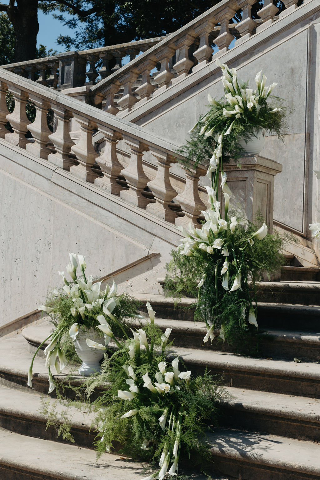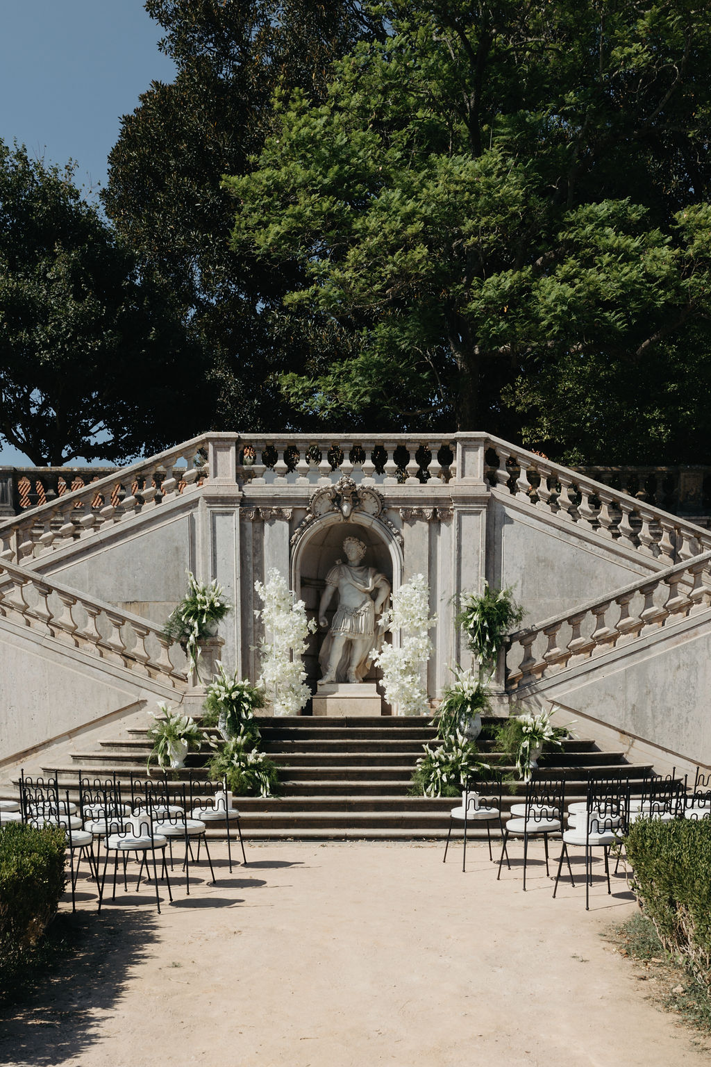 A black-tie destination wedding in Lisbon set inside Jardim Botânico Vandelli — historic architecture, wild greenery, and a clean, confident event design concept. The ceremony focused on sculptural white florals and strong spatial composition. Minimal palette, maximum impact — a modern approach to a luxury wedding in Portugal where design leads and decoration follows. Dinner centered around one long statement table beneath the trees — deep-toned hydrangeas, crisp linens, and sharp table styling created contrast and rhythm across the space. Structured but effortless — exactly what modern couples want from a wedding designer in Portugal. As the sun dropped, suspended lighting shifted the atmosphere from garden dinner to editorial nightscape. A destination wedding in Portugal built around clarity, proportion, and visual identity.